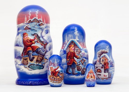 This 5-piece nesting doll illustrates the Russian tale of Emelya and the Magic Pike sometimes called The Will of the Pike In the story lazy Emelya catches a magical fish that grants him infinite wishes in return for his release Emelya lets the fish go and has many adventures before finally becom Read More..
